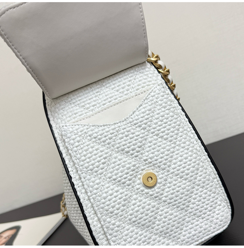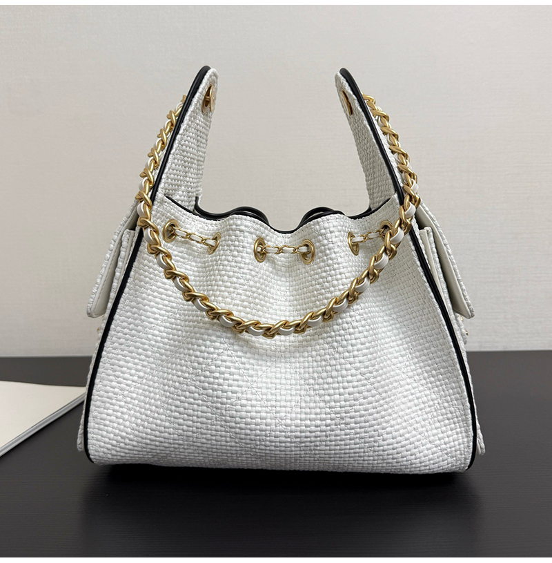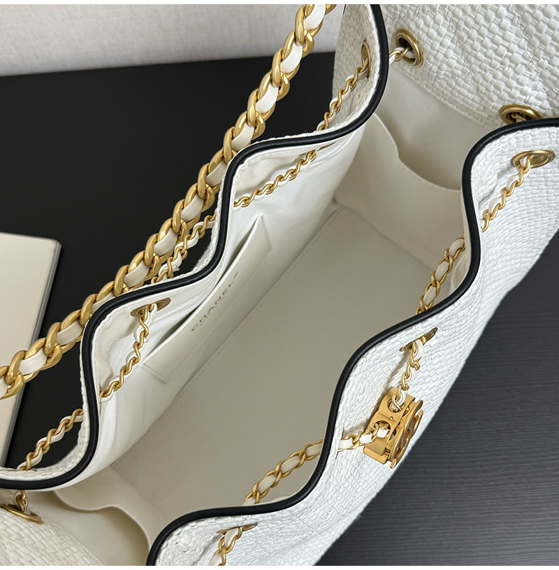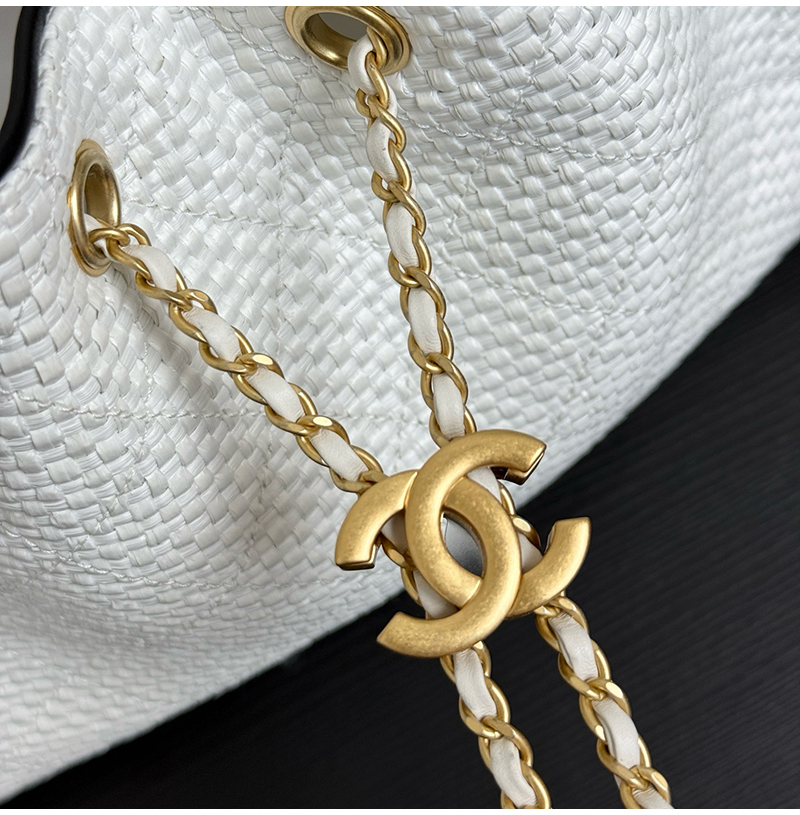 클래식한 버킷백 디자인, 퀼팅 패턴 ,드로우스트링, 더블 C 메탈 자물쇠가 돋보이는 감각적인 디자인! 베이지 컬러 브레 이드 소재는 가볍고 내구성이 좋으며, 블랙 포인트가 고급스 러움을 더해 데일리룩이나 캐주얼 자리 모두 잘 어울려요. 스몰 사이즈지만 수납력이 좋아 핸드폰, 화장품 등이 쏙 들어가고, 숄더 & 크로스 가능해 실용적이면서도 스타일리시! 최근 트렌디한 아이템으로 심플하고 우아한 스타일이 패션계 에서도 인기가 높아 다양한 코디에 쉽게 매치할 수 있어 눈길을 사로잡는 필수템입니다. 구매 만족도1위, 재구매율1위, 홍콩명품by럭셔리즘
